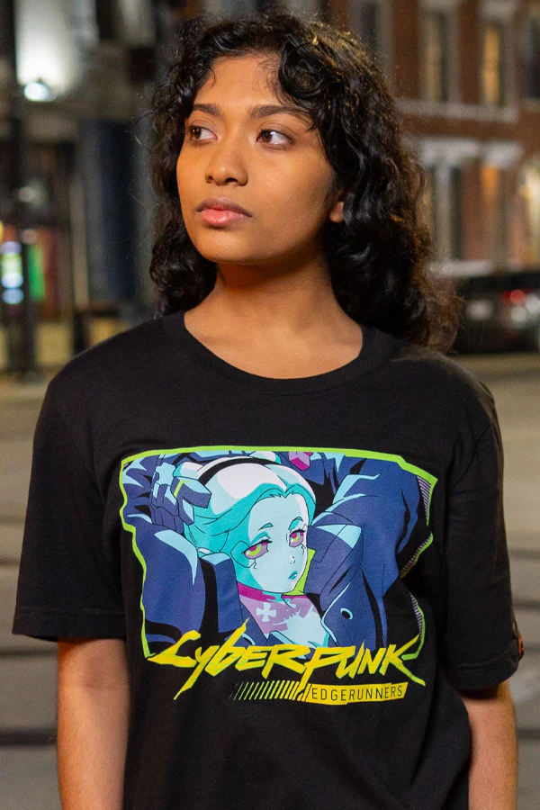 This high-quality tee commands attention with its sleek black fabric and bluish tones, showcasing the enigmatic Rebecca with her arms crossed behind her back. The stylized portrait captures her tough and determined demeanor, while the yellow Cyberpunk: Edgerunners lettering below the image adds a bold and striking touch.