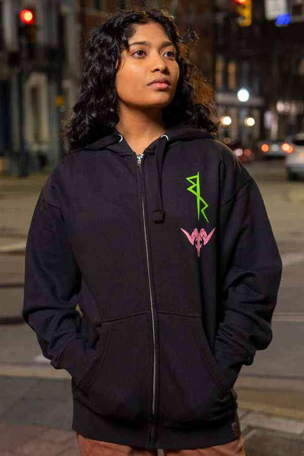 The back of the hoodie showcases a crazy mashup of manga magic that screams Rebecca's electric vibes. The front of the hoodie includes the Edgerunners logo and her ram skull icon. It's blacker than Night City's humor, and just as artsy — the ultimate wearable rebellion, compliments of the one and only Rebecca!Â
